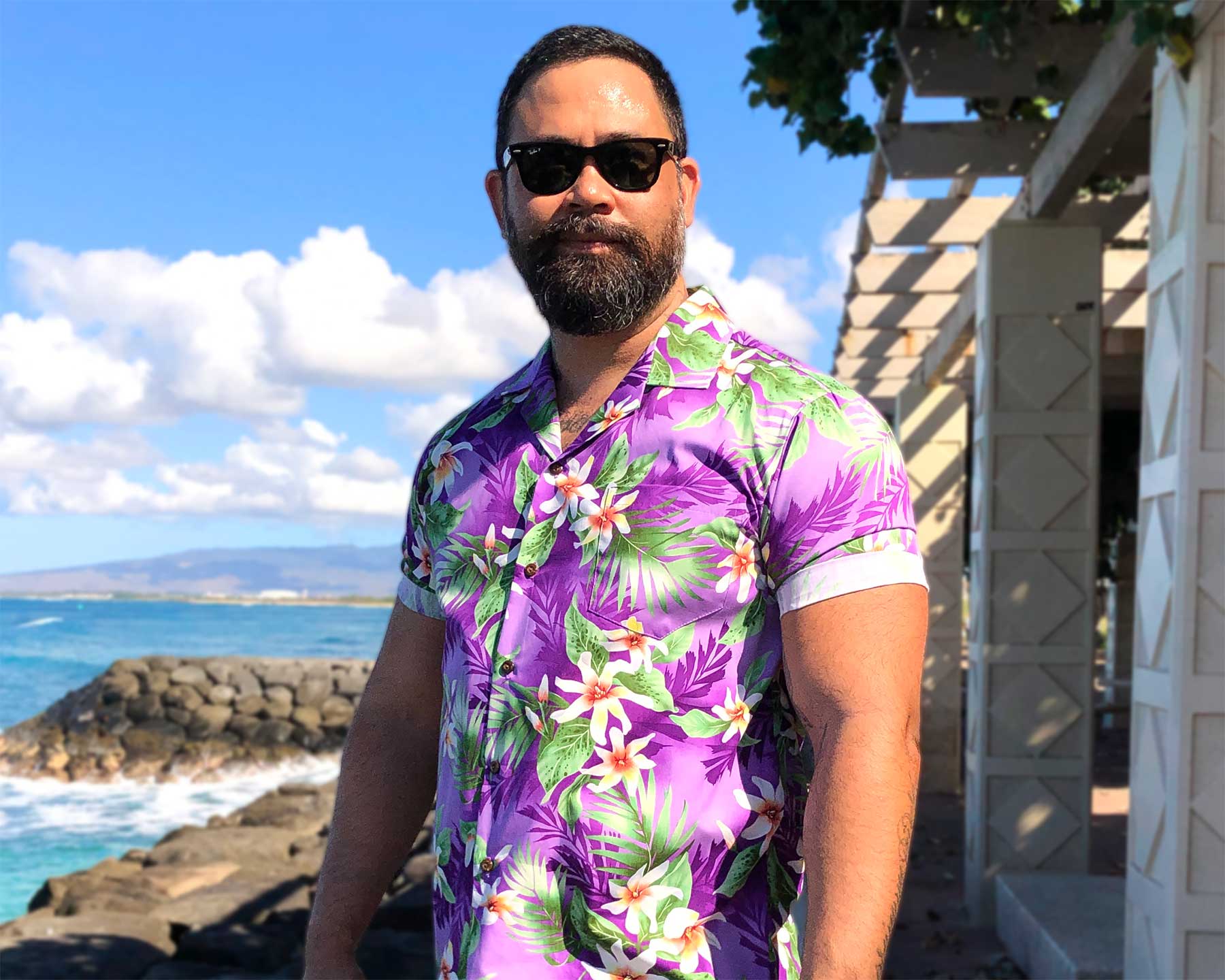 This bold and colorful shirt features colorful flowers and leaves on a purple background. This Vibrant Flower Garden purple Hawaiian shirt is made of 100% cotton and has a matched pocket and real coconut buttons.