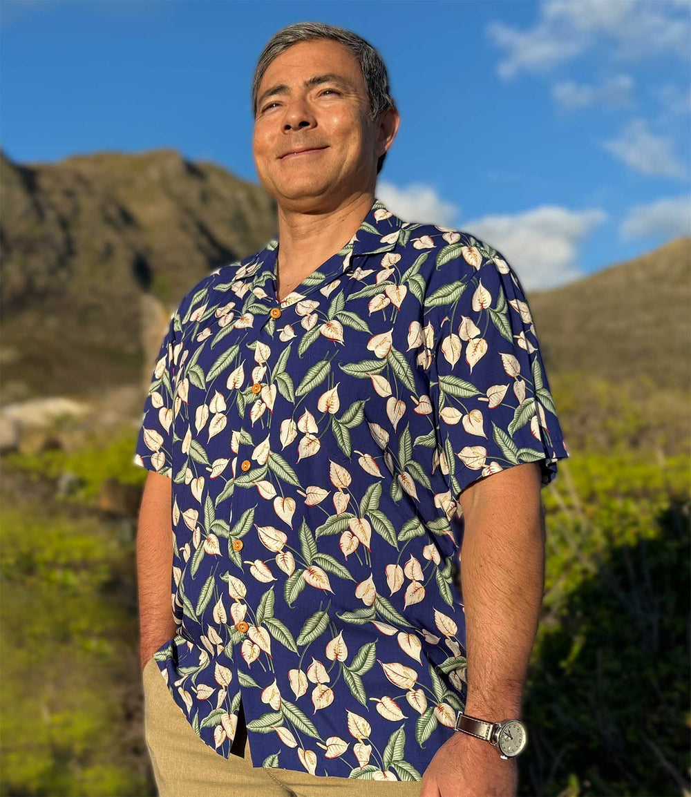 This Mini Anthurium blue was discontinued by Paradise Found and was not available for a few years. But they decided to bring it back in late 2024 due to numerous requests by fans of Magnum PI and the K-Pop group BTS. This shirt was worn by Tom Selleck in Magnum PI in the 1980s. In 2024 Jungkook of BTS is seen wearing it in a social media post by Taehyung in Hawaii while their manager wore the red Jungle Bird Magnum PI shirt. The print features light colored khaki anthuriums on a blue background. This premium Hawaiian shirt is made of 100% super soft rayon and comes with a matched pocket and real wood buttons.