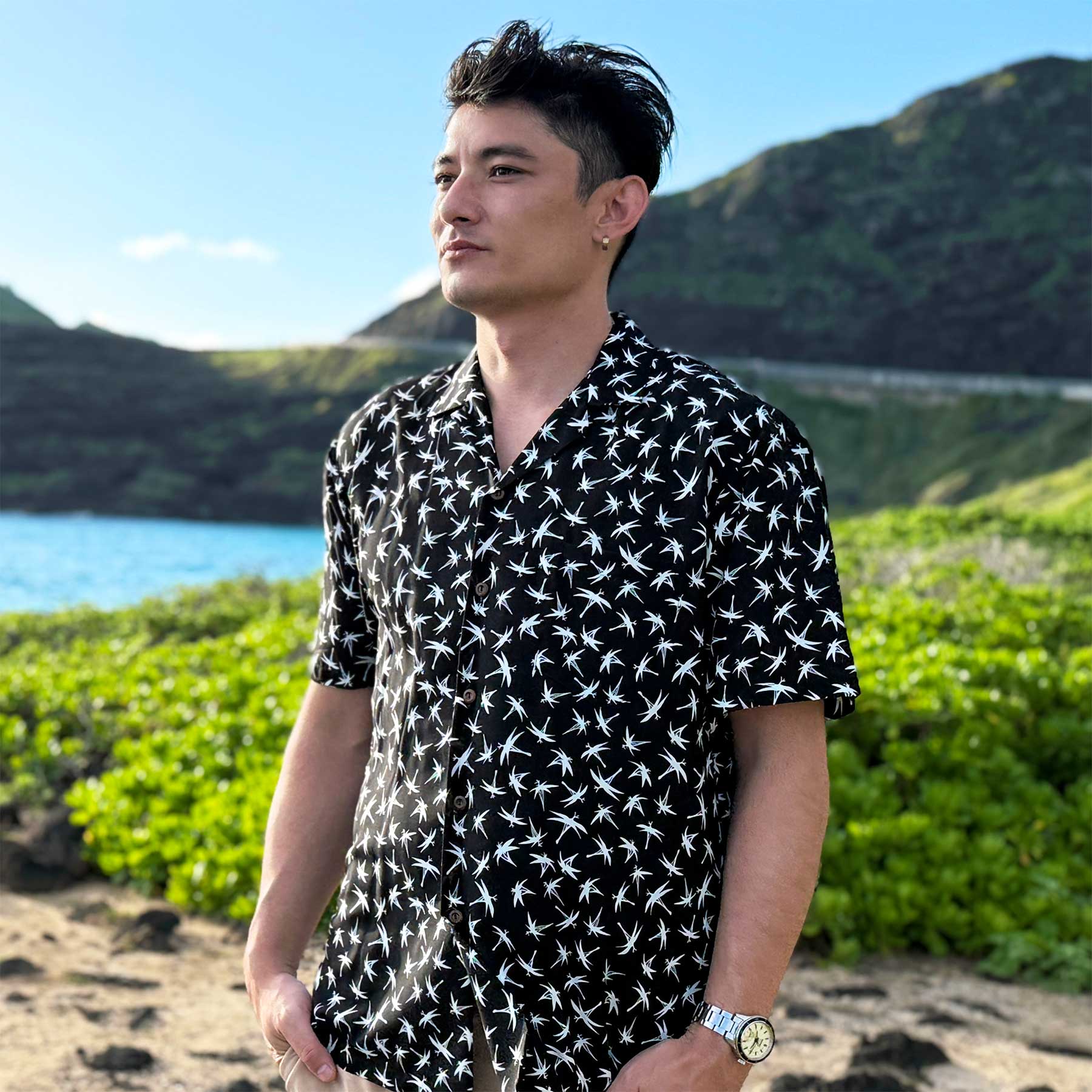 This is the black version of the Midnight Bamboo shirt made by Paradise Found that was worn by Tom Selleck in Magnum PI. After becoming popular in the 80s from the TV show, it has been out of production ever since. It is now back and available for fans of the show and of Aloha shirts to enjoy. This shirt was also worn by Jay Hernandez in the Magnum PI reboot, Season 2, Episode 8 "He Came By Night".