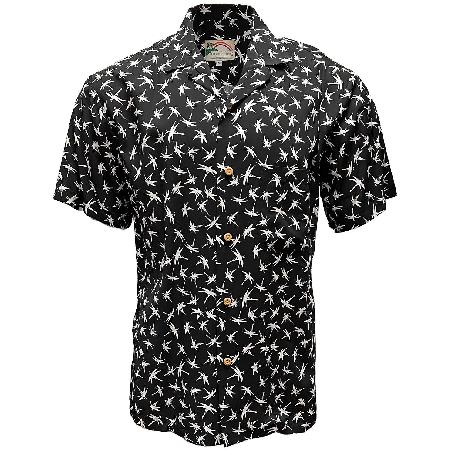 This 100% rayon shirt features small bamboo design elements on a black background and comes with a matched pocket and real wood buttons.