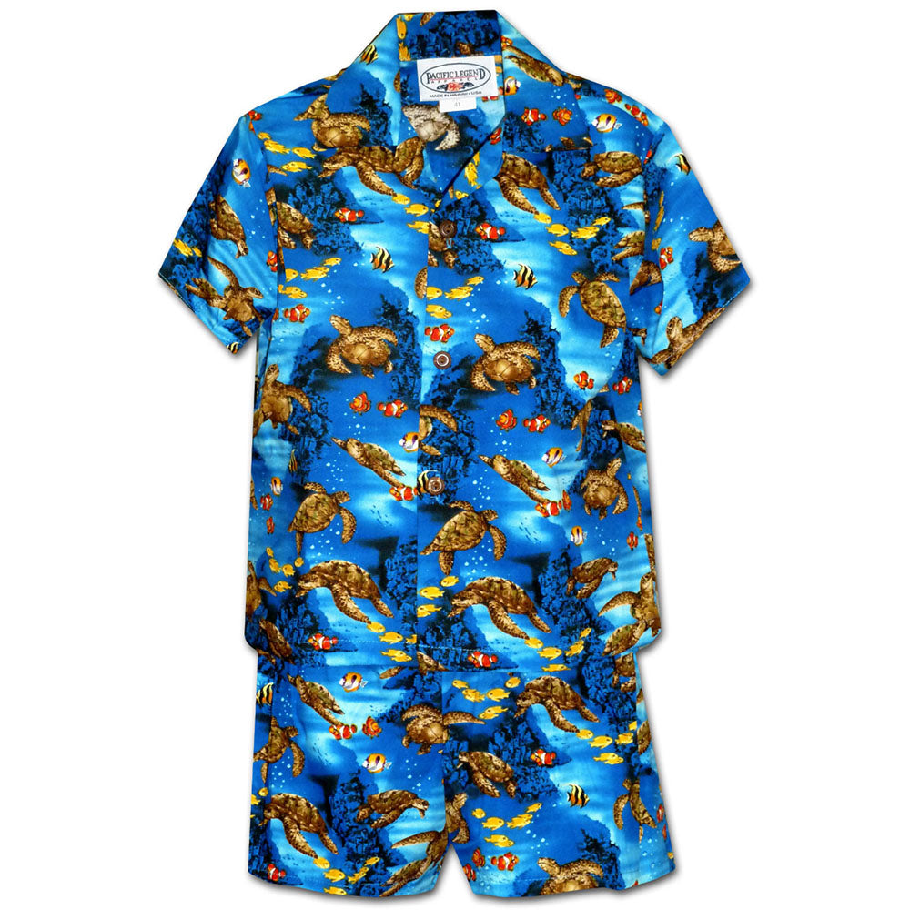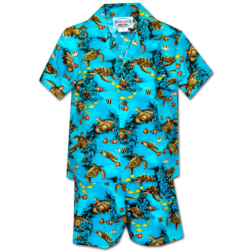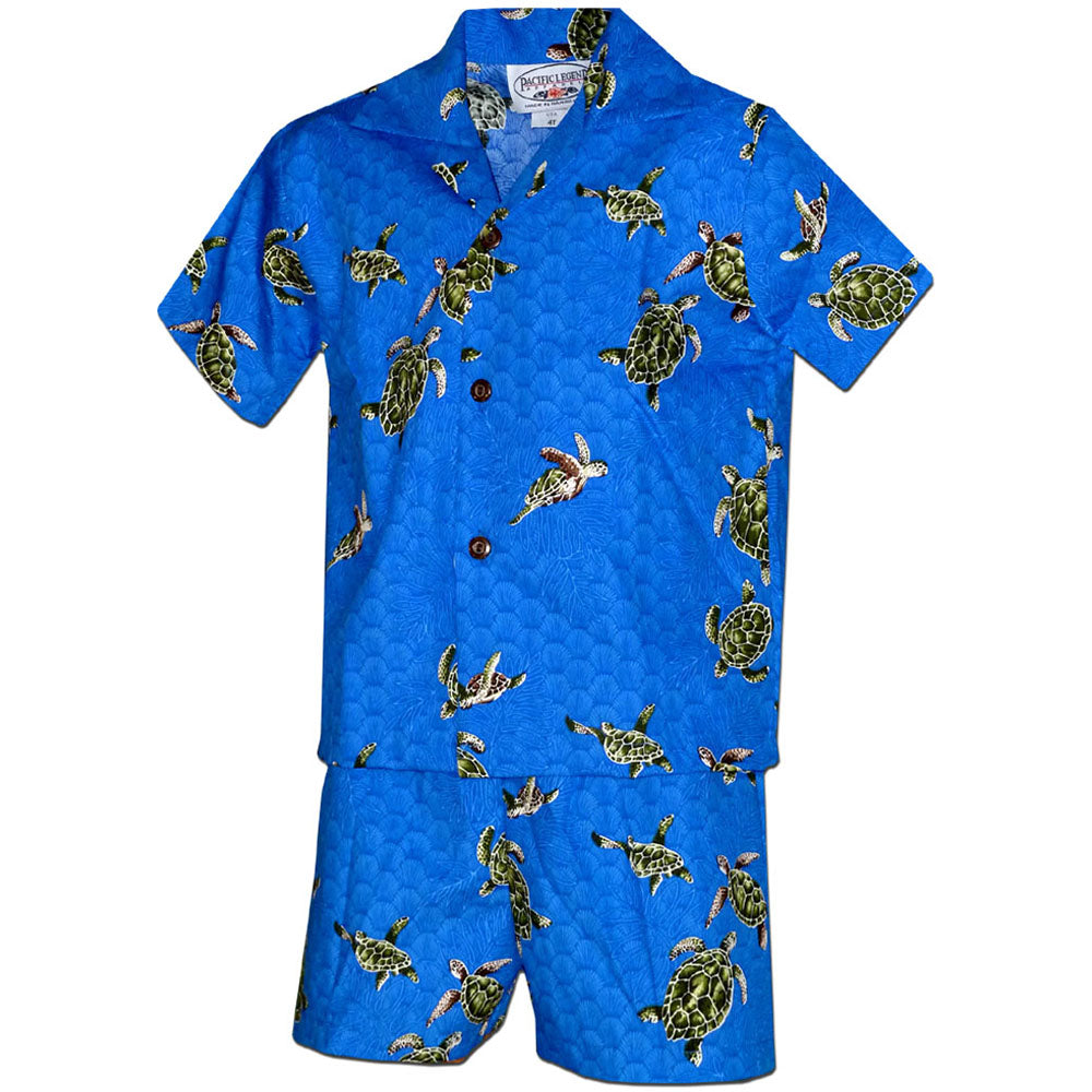 Next time you go on a family vacation, your son will love embracing the fun vibes with a Boy's Hawaiian Shirt and Shorts Set. Matching sets are also a perfect choice for school pictures, family barbeques, family photography sessions or any other occasion. Dress your son in a Fishy Time Blue Boy's Hawaiian Shirt and Shorts set to help him get into the fun summertime mood. For the more fashion-forward child, an Island Little Prince Blue Boy's Hawaiian Shirt and Shorts set is a very mature and stylish choice. If your little boy loves sea animals, then he'll adore a Turtle Time Blue Boy's Hawaiian Shirt and Shorts set to wear to school and show all of his friends. Whichever matching boy's shirt and shorts set you choose, your little one is going to love the fun prints, bright colors and comfortable fit of a Boy's Hawaiian Shirt and Shorts Set from Aloha FunWear.