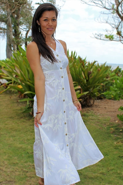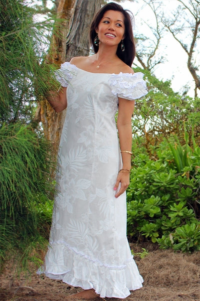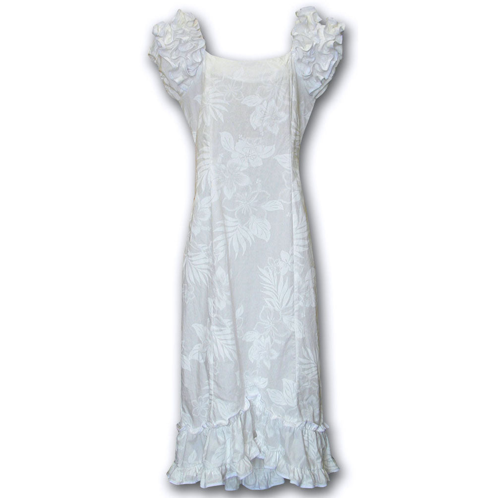 A casual beach wedding dress or muumuu for the bride and a Hawaiian wedding shirt for the groom are a stylish way to watch down the aisle. Many couples choose matching Hawaiian wedding clothing with a set of white prints for themselves and something a little more colorful for the bridesmaids and groomsmen, but you order whatever you want for this important day. Our beach wedding dresses are made in Hawaii and include white ruffle Hawaiian dresses, button front long dress, tank dress, and spaghetti dresses.